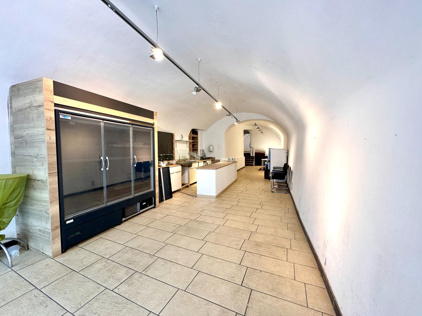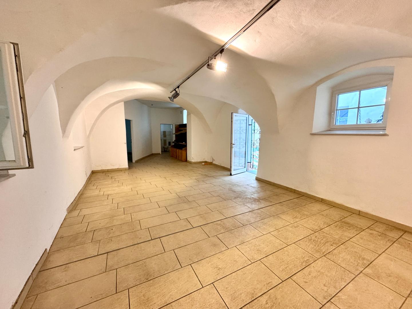Die Geschäftsfläche verfügt straßenseitig über zwei große Glasportale, die viel Tageslicht in den Innenraum bringen. Sie betreten die Immobilie über eines der beiden Portale und gelangen direkt in den ersten ca. 68 m² großen Verkaufsraum.Dieser Raum verfügt über eine Gewölbeform, wodurch ein charaktervolles Ambiente gegeben ist, welches Sie stilvoll in Szene setzen können.